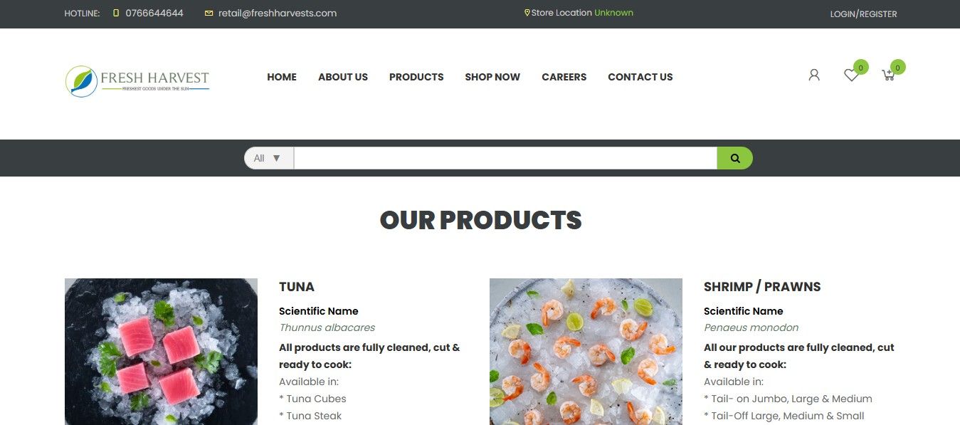 Fresh Harvest likely faced the critical e-commerce challenge of low customer trust regarding the quality and freshness of their perishable goods, specifically certified seafood. Despite the bold claim, the existing design provided insufficient transparency around the logistics and sourcing process. This lack of visible proof and the ambiguous "Store Location: Unknown" deterred first-time buyers and led to high friction during the checkout phase, ultimately resulting in elevated cart abandonment rates and a reliance on potentially costly customer service inquiries to quell freshness concerns.